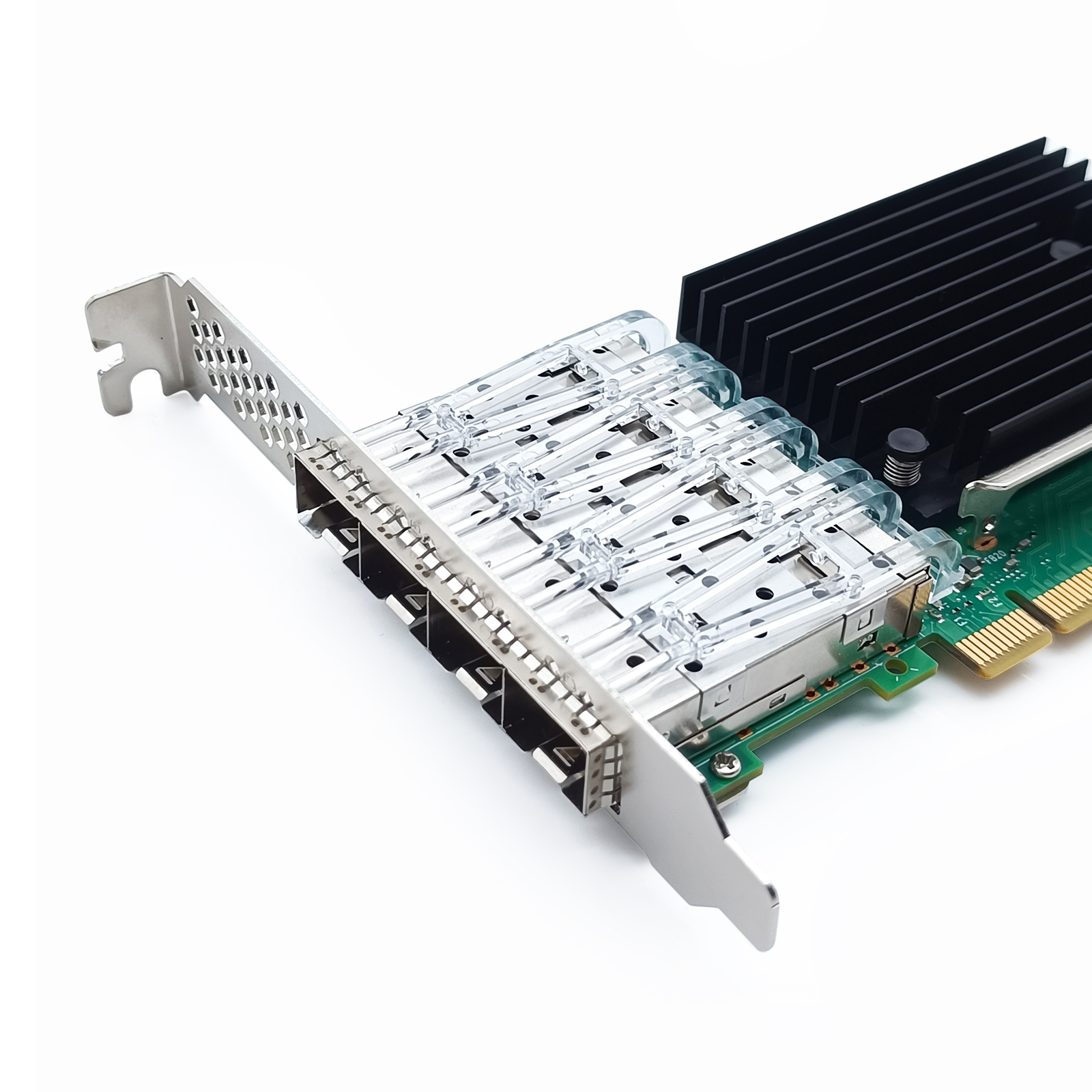 Based on the Intel E810 controller, this adapter features 4x 25G SFP28 ports, each supporting data rates of 1Gbps, 10Gbps, and 25Gbps. It is compatible with DAC, AOC, and various SFP28 optical modules (1000BASE-SX/LX, 10GBASE-SR/LR, 25GBASE-SR/LR), ensuring flexible and high-bandwidth connectivity for data centers.