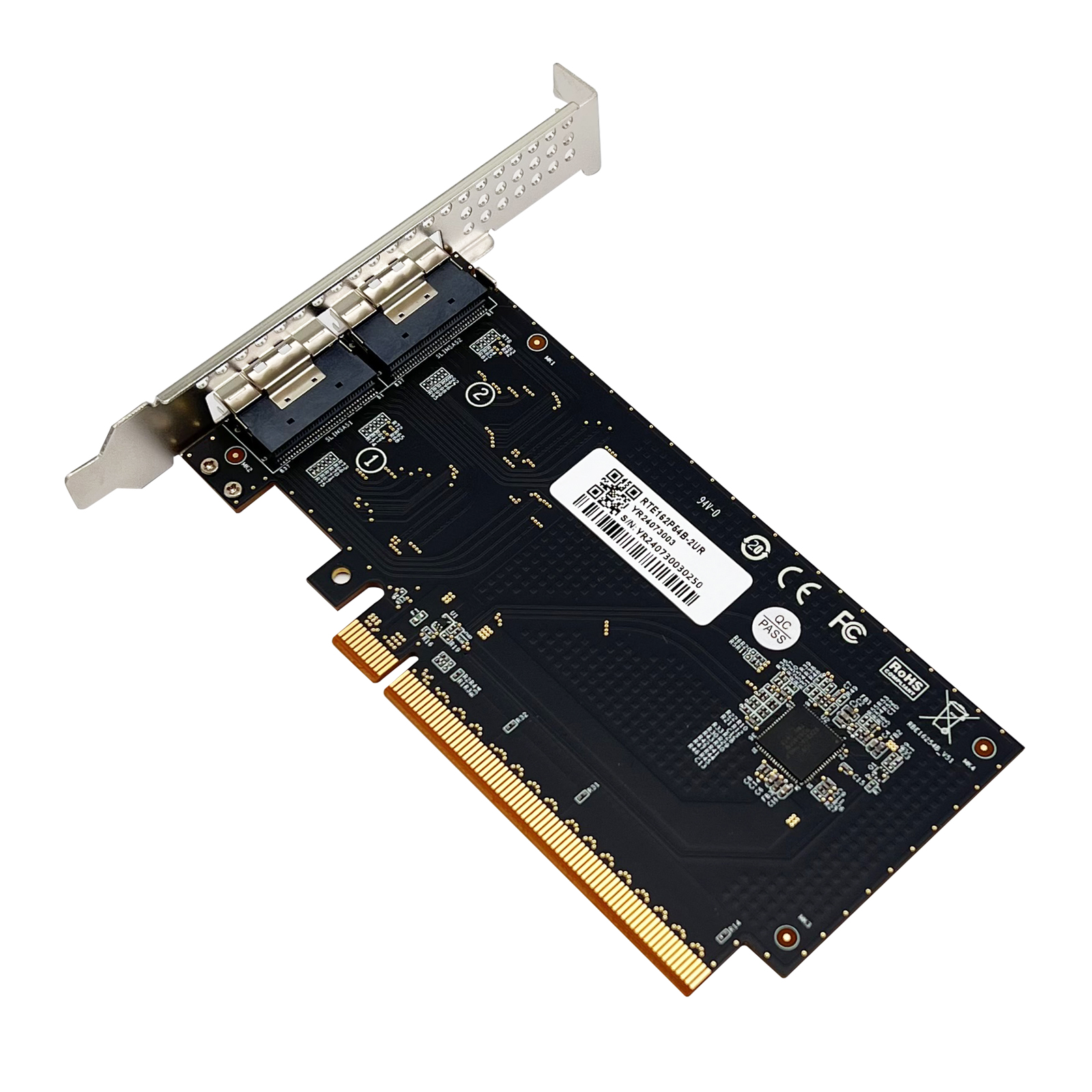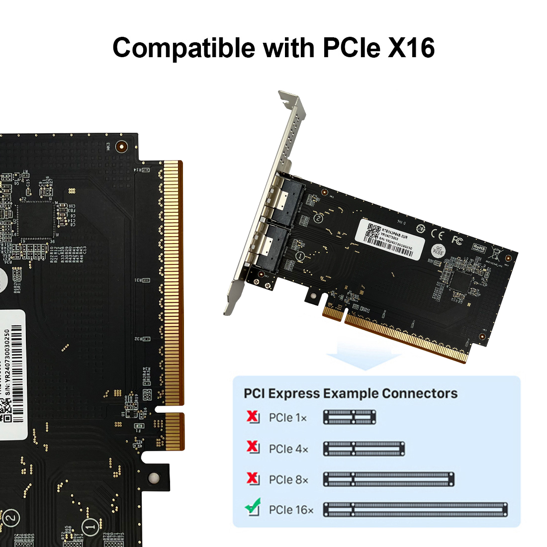 Gen4 SFF-8654 Adapter, dual ports SFF-8654 8i to PCIe 4.0 X16 slot, with bracket design, application for link with NVMe SSD. NOT SUPPORT SAS SSD.