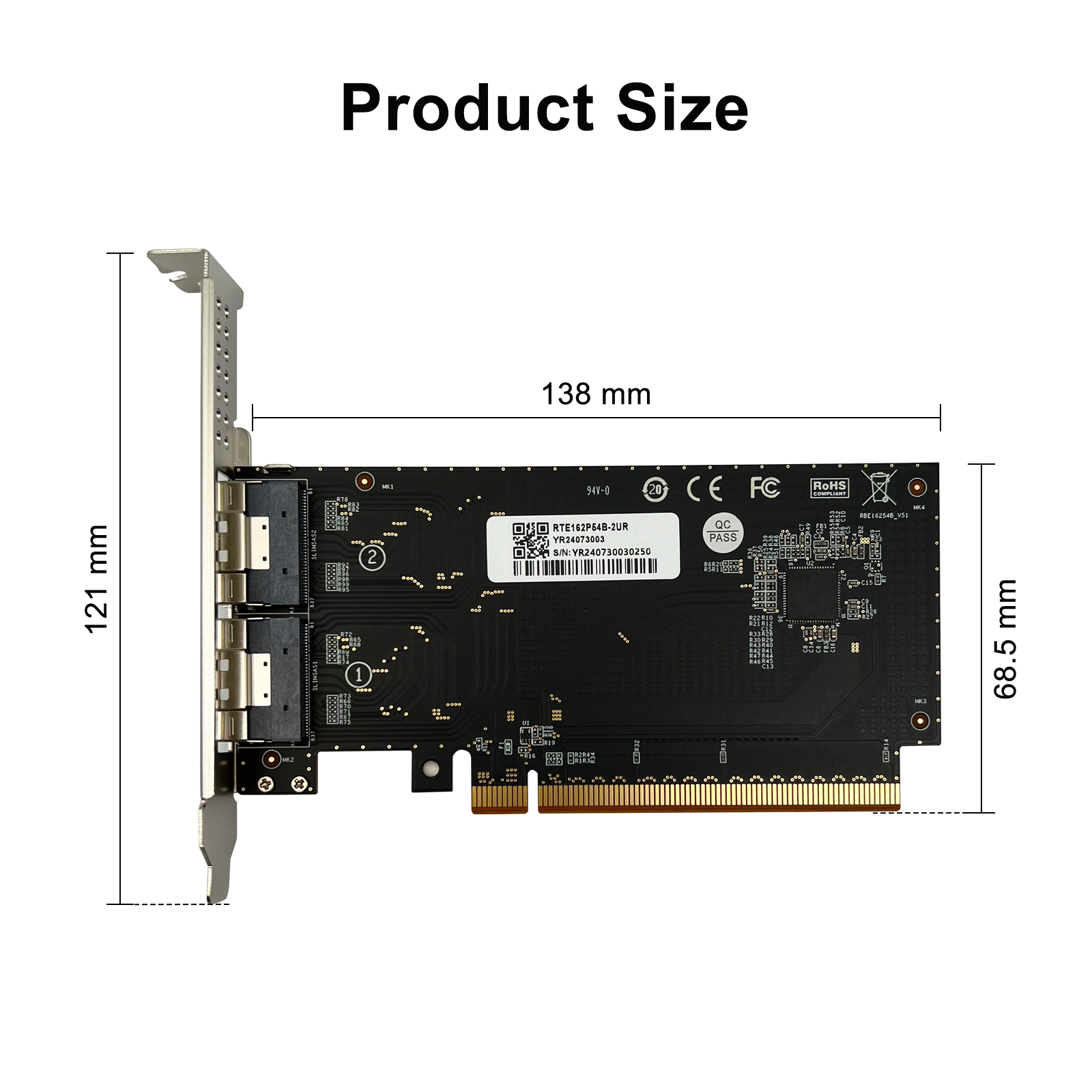 ● 2xSFF-8654-8i outputs, achieving PCIe 4x, 8x, or16x extension or adaptation, used for external U.2 NVMe drive enclosures and external GPU extension.