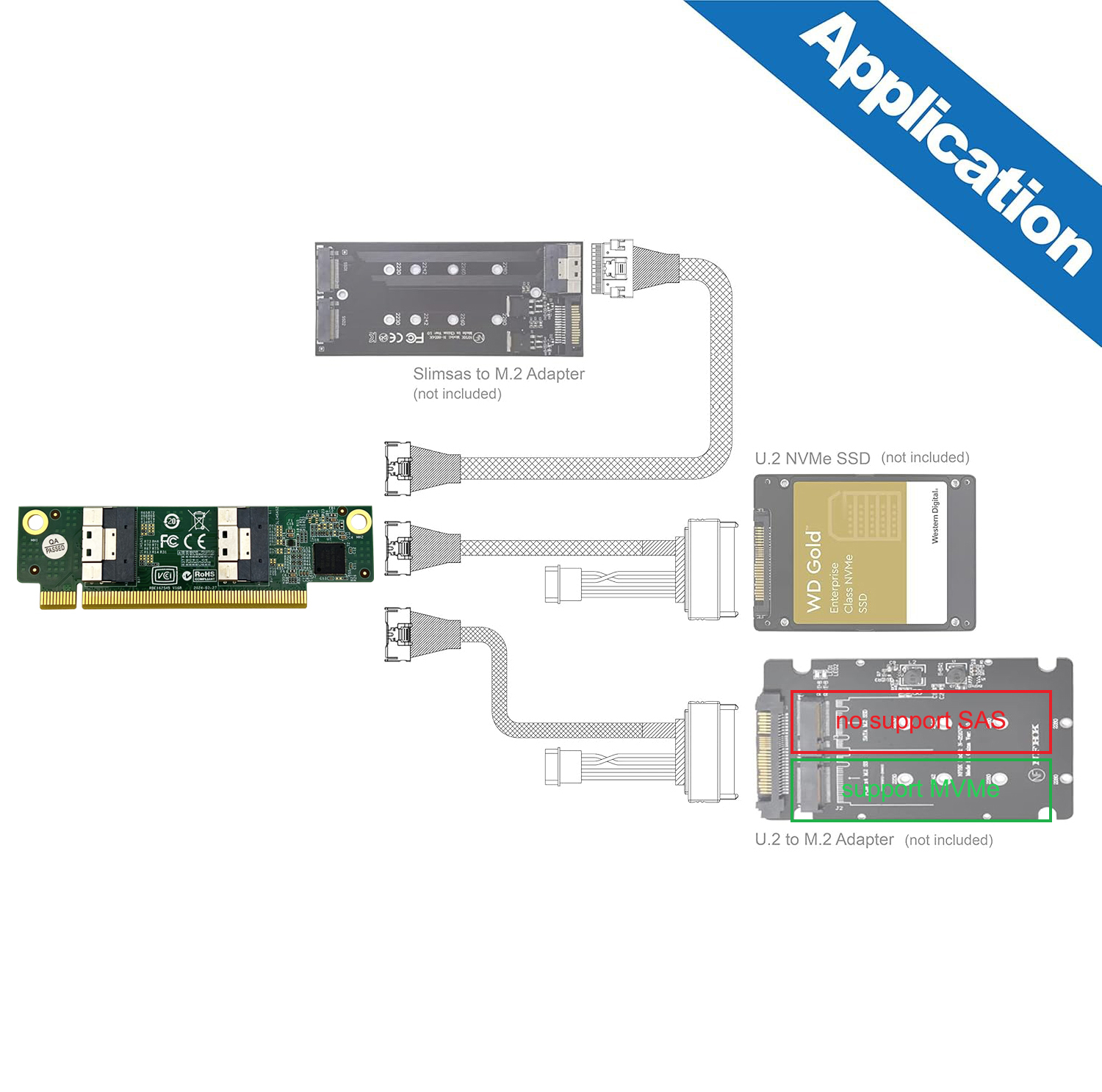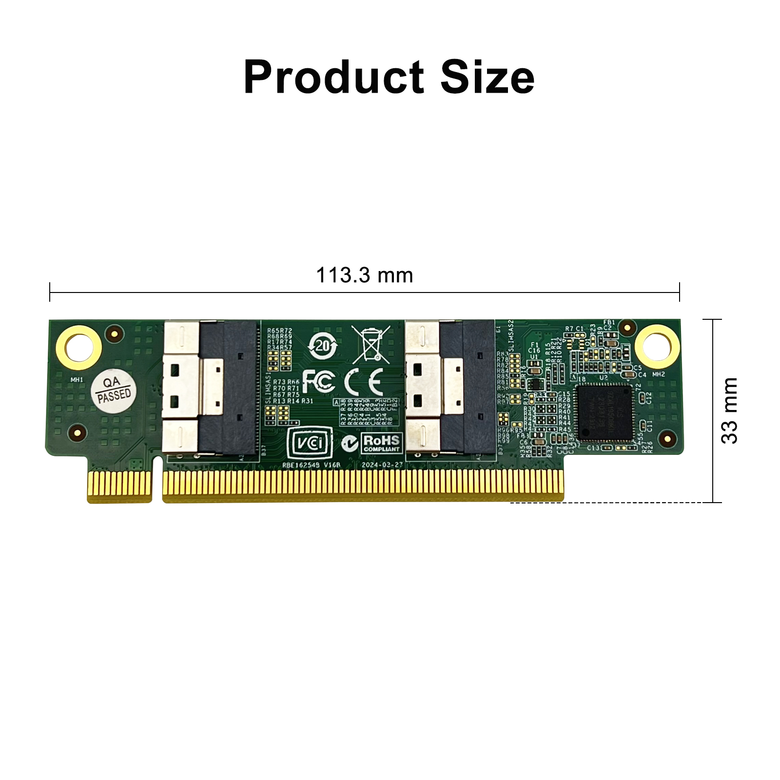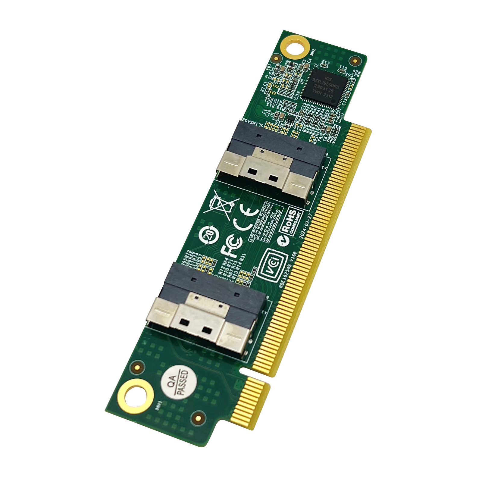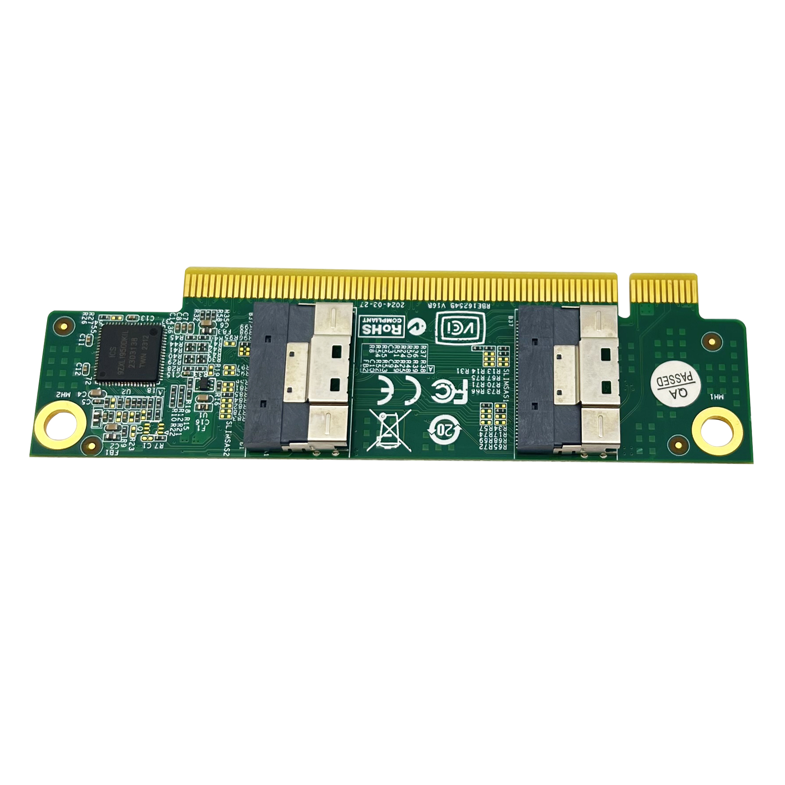 Gen4 SFF-8654 Adapter, dual ports SFF-8654 8i to PCIe 4.0 X16 slot, without bracket, application for link with NVMe SSD. NOT SUPPORT SAS SSD.