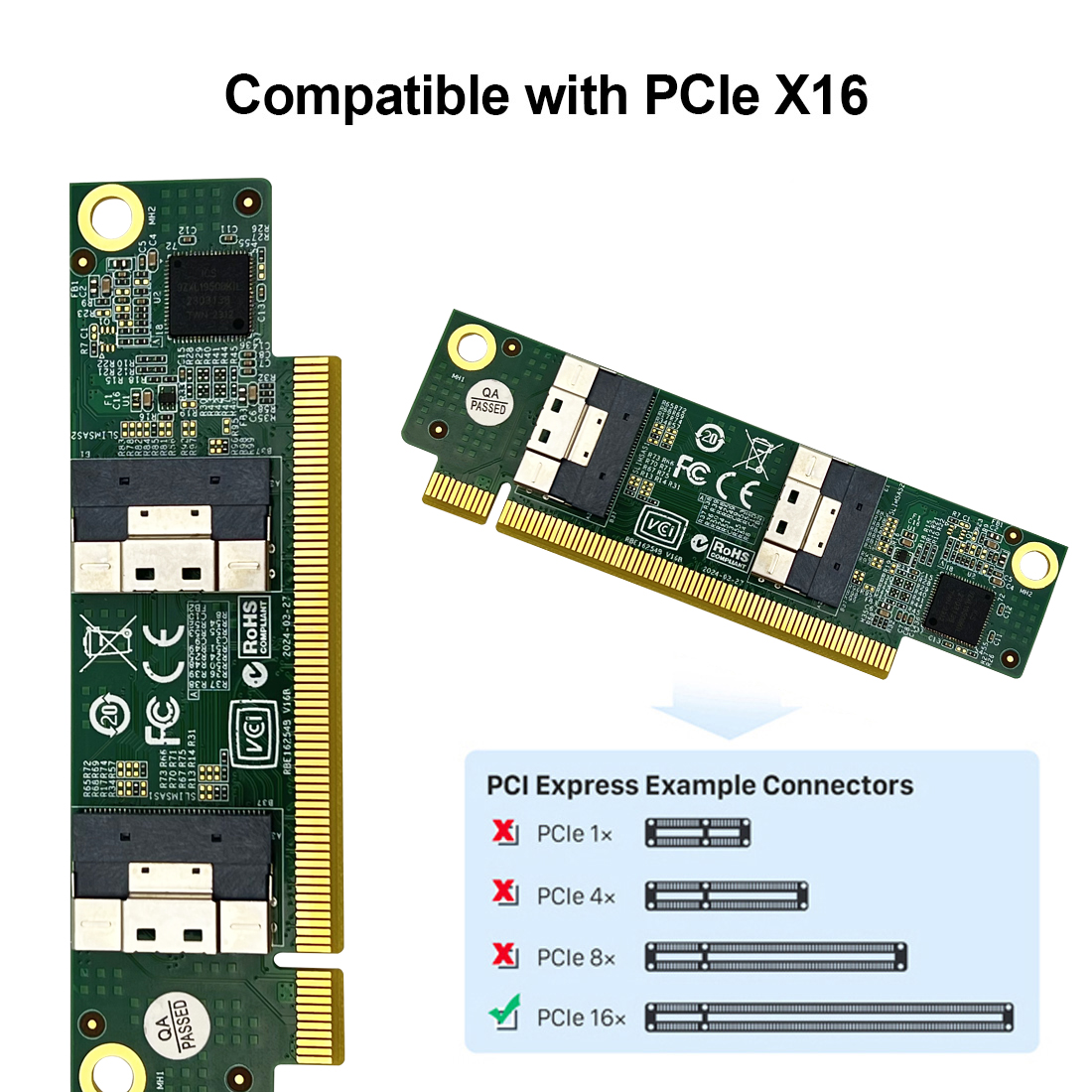 ● Supports PCIe 16x (with 2 cables) or 8x (with 1 cable), and also support
