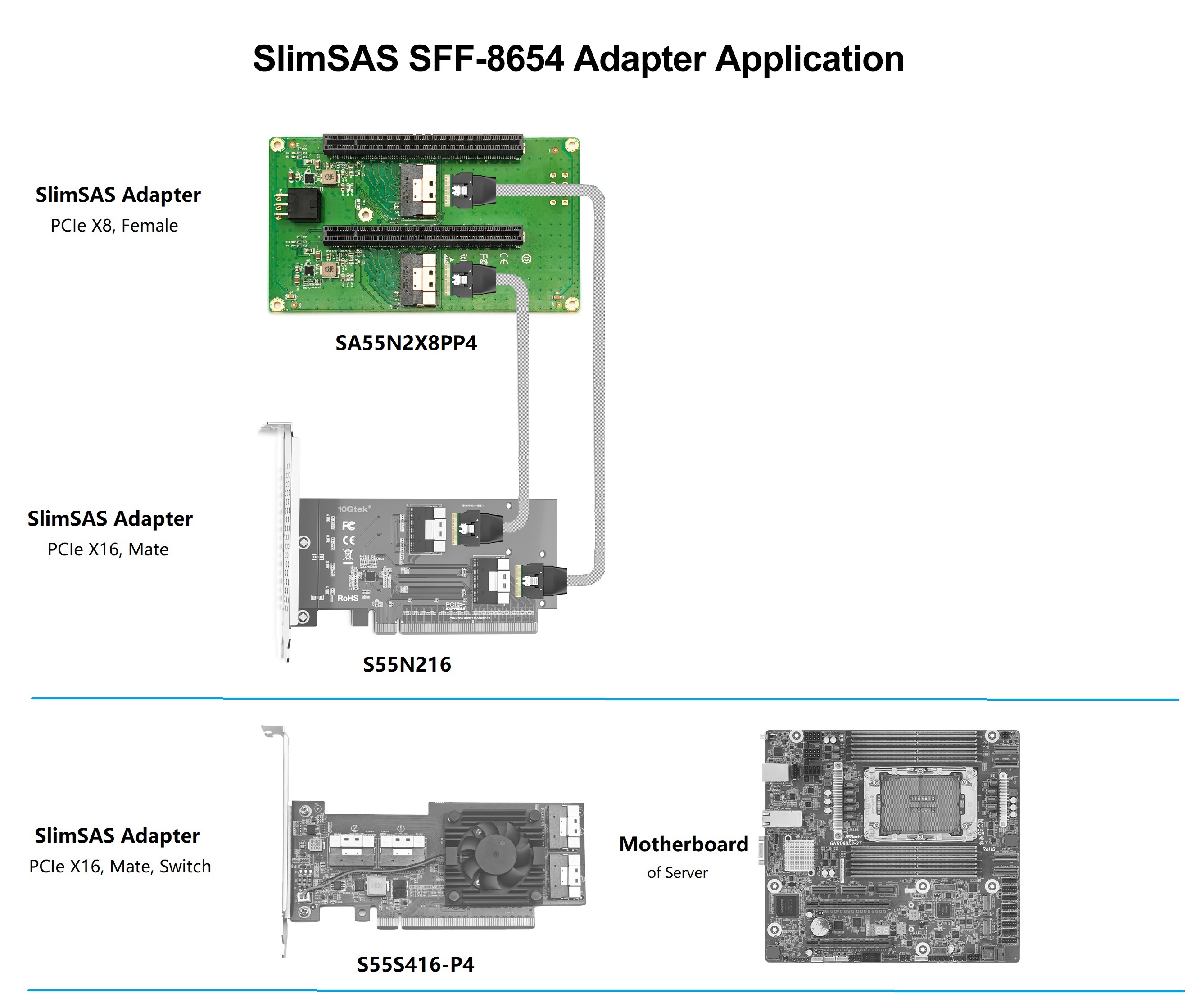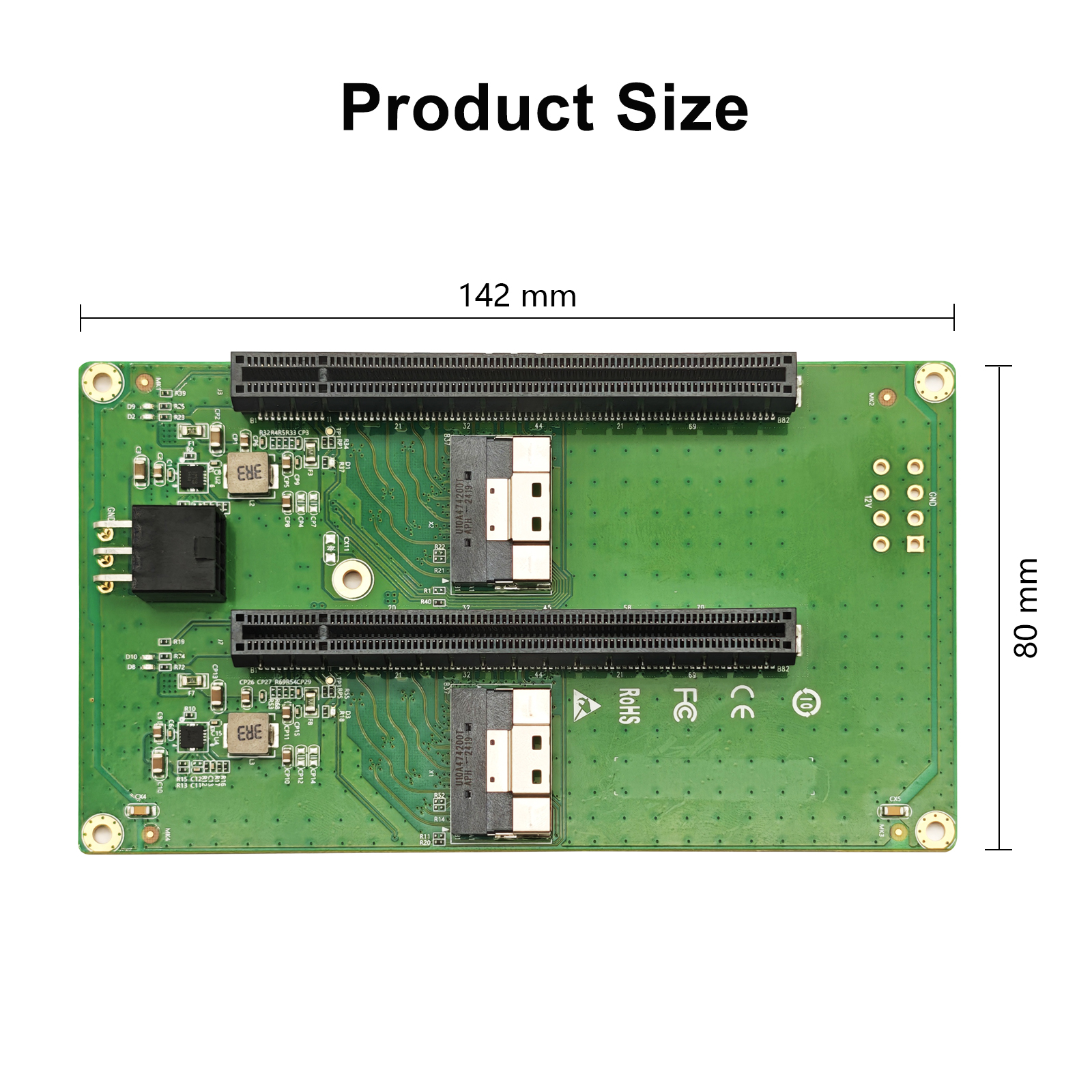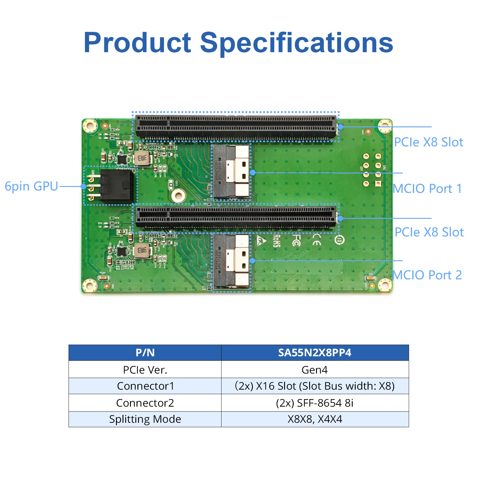 ● Dual SFF-8654 8i connector, Dual PCIe X16 slot, support PCIe X4/X8 bandwidth, need the motherboard or BIOS bifurcation to X4 or X8 mode.