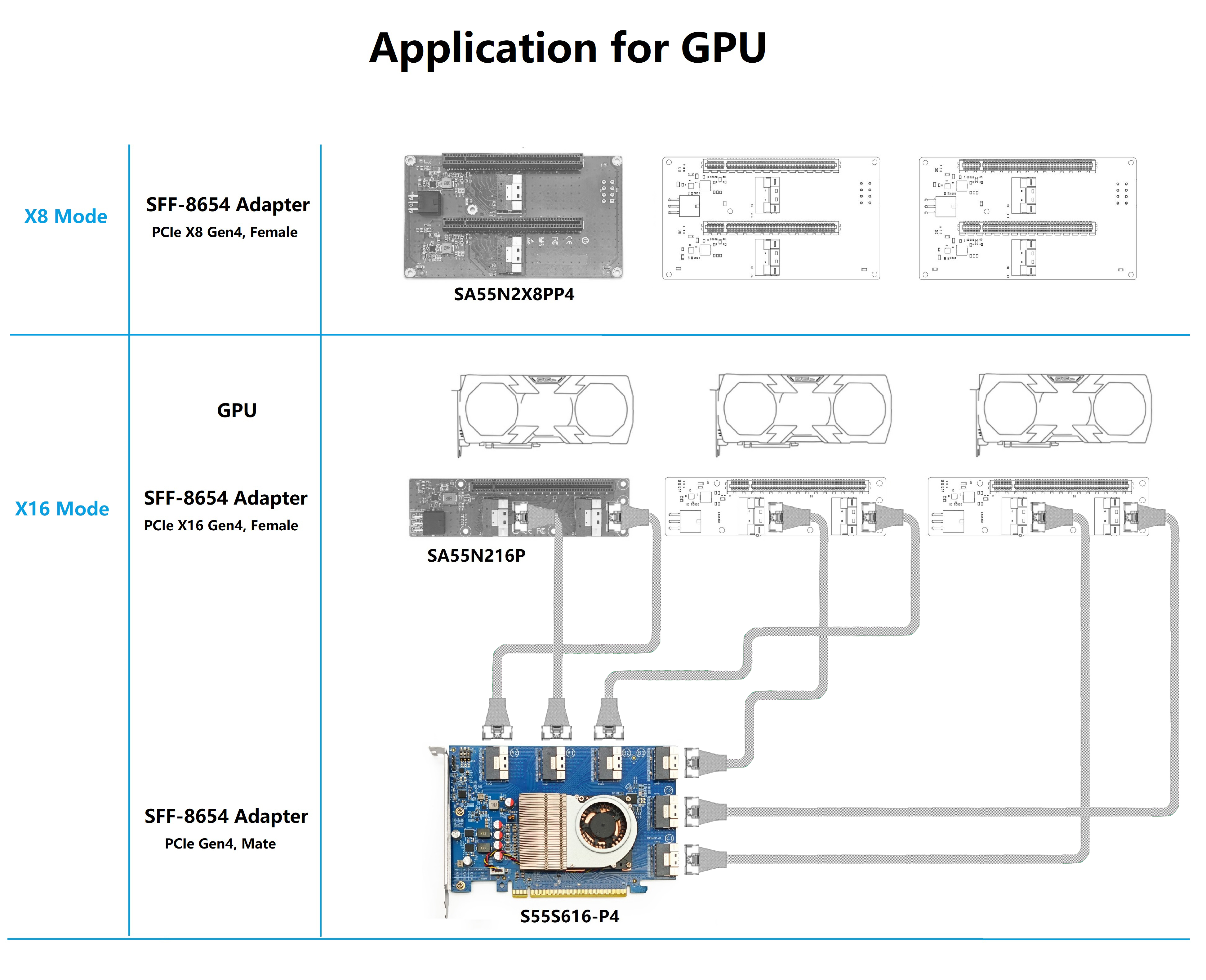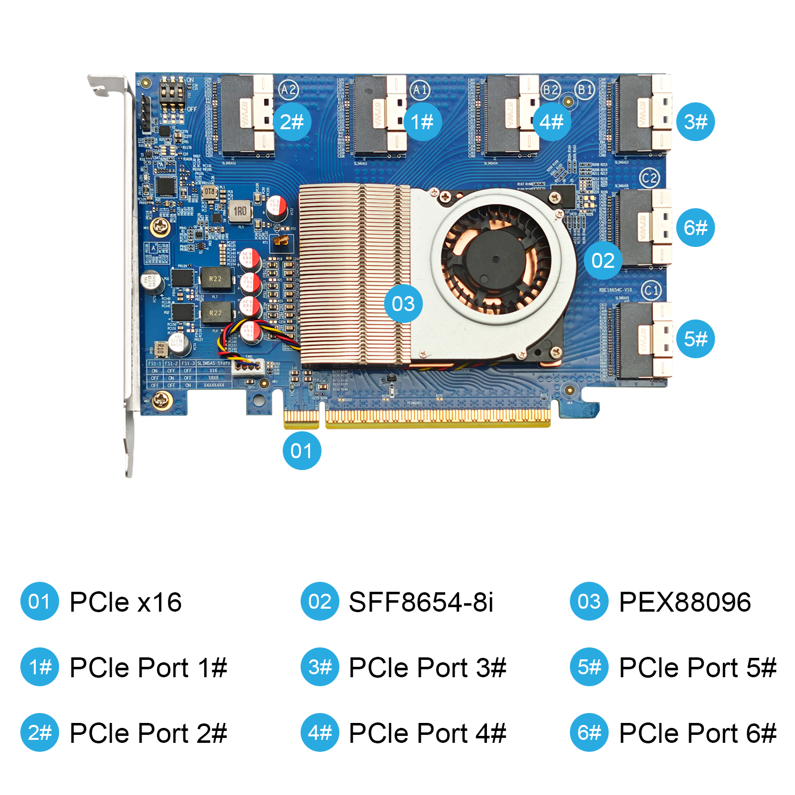 PCIe4.0 X16 to (6x) SFF-8654 8i Adapter, for GPU & NVMe SSD, PEX88096 Controller with Bifurcation function