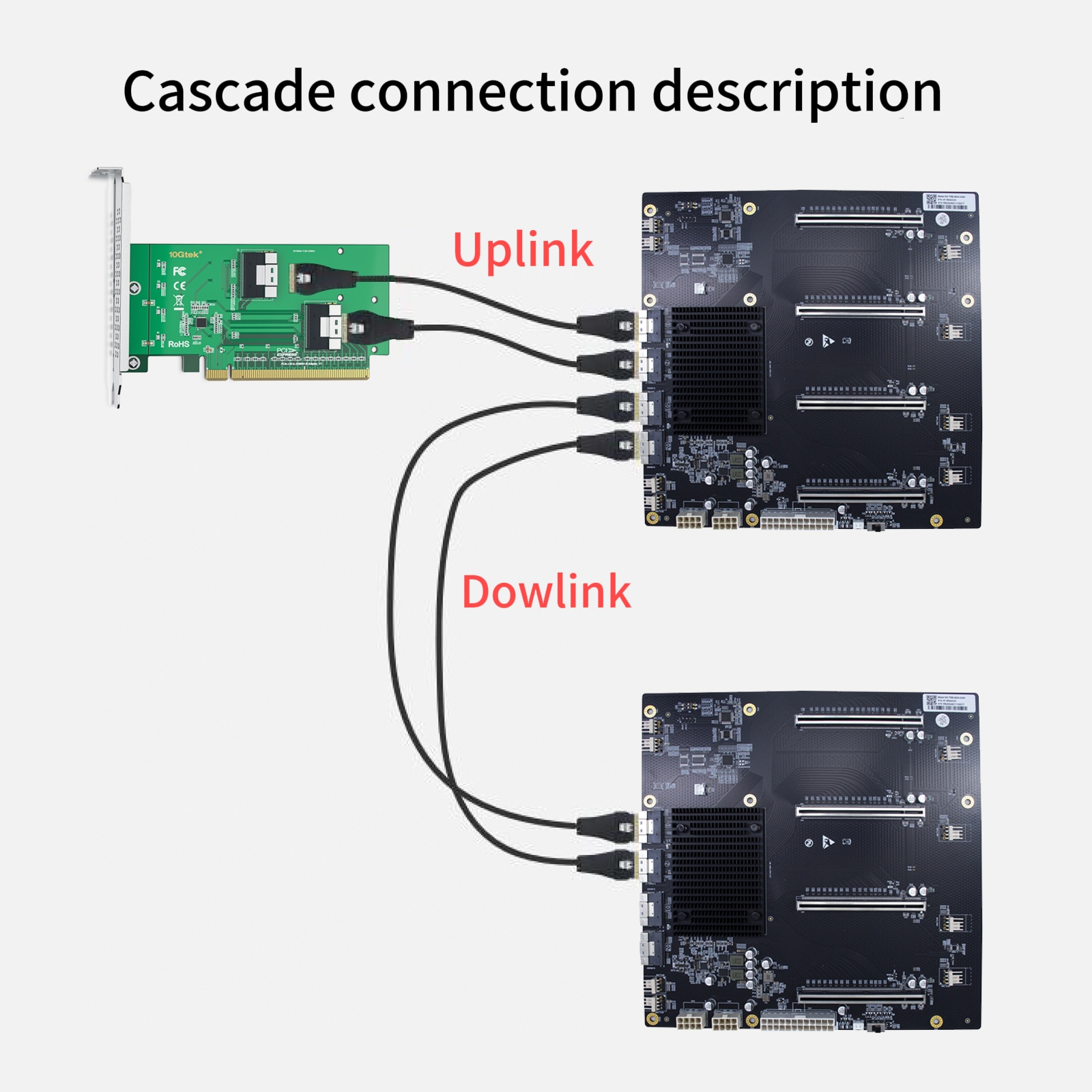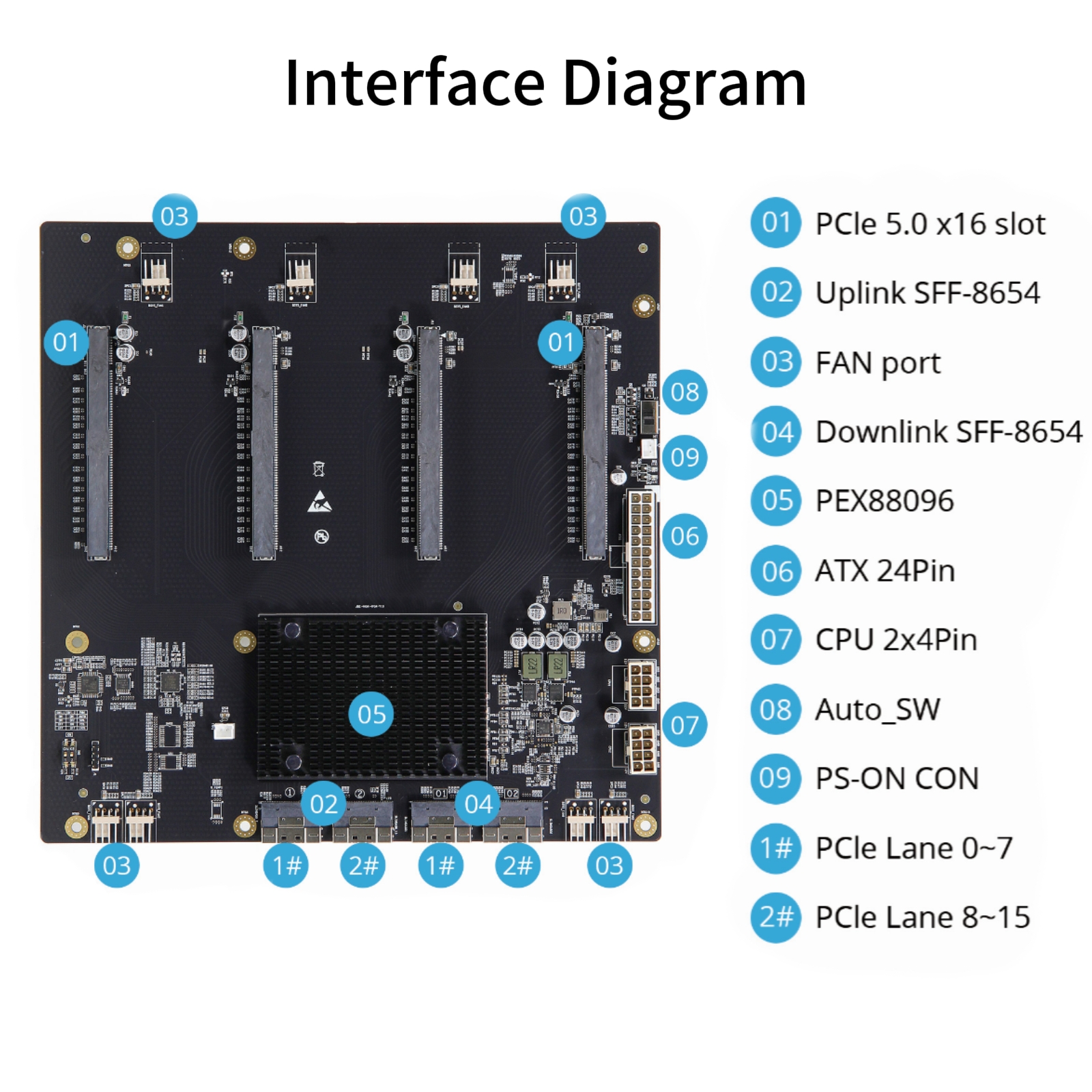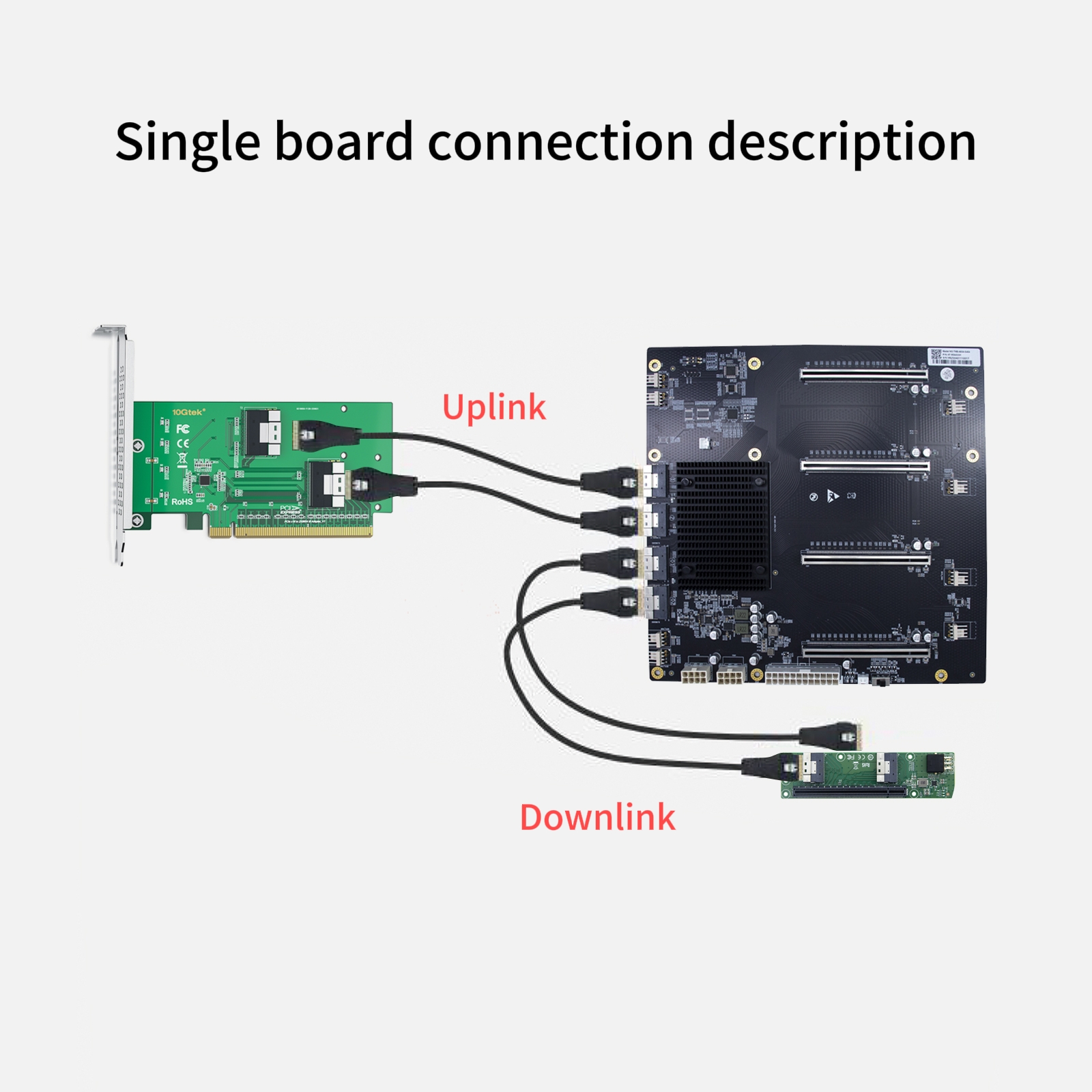 ● 4-Port SFF-8654 8i interfaces: Two ports for uplink (expansion card sends data), two ports for downlink (motherboard sends data).