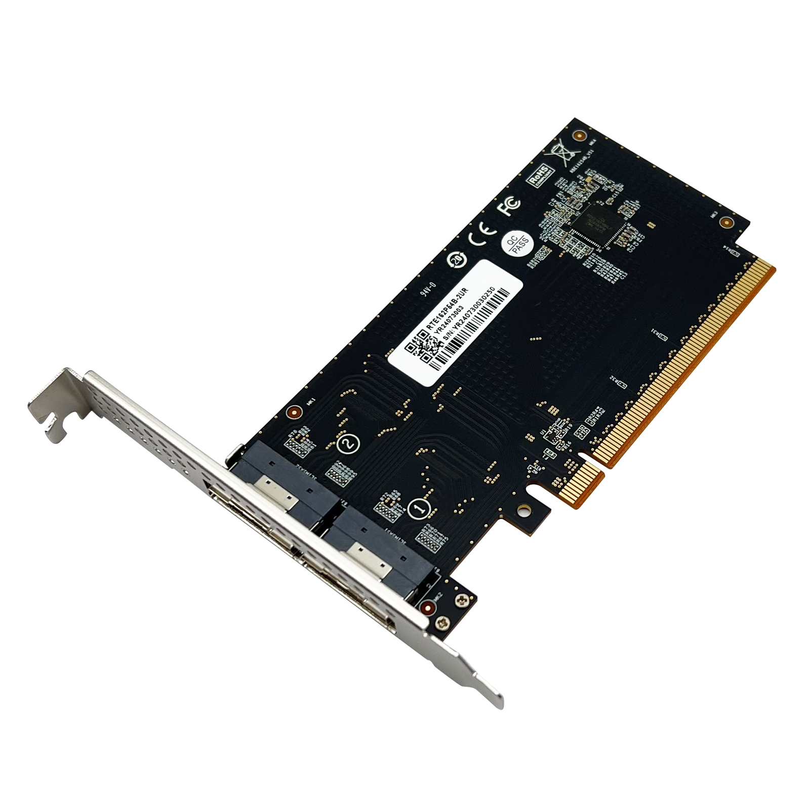 ● 2xSFF-8654-8i outputs, achieving PCIe 4x, 8x, or16x extension or adaptation, used for external U.2 NVMe drive enclosures and external GPU extension.